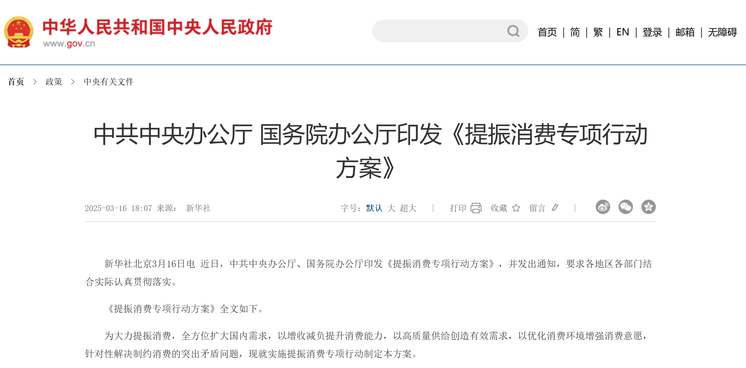 中共中央办公厅 国务院办公厅印发《提振消费专项行动方案》