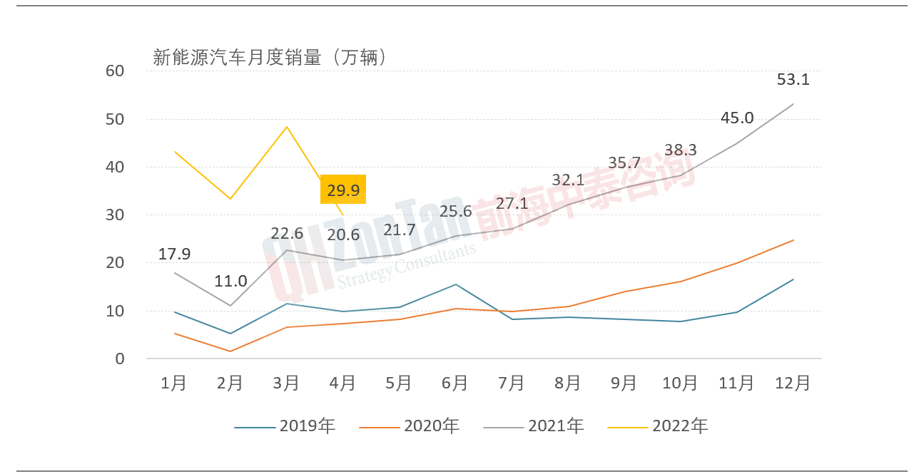 据中国汽车工业协会统计分析,2022年4月新能源汽车虽也受到疫情影响,但依然高于上年同期水平,总体表现较好。2022年4月,新能源汽车产销分别达到31.2万辆和29.9万辆,环比下降33.0%和38.3%,同比增长43.9%和44.6%,市场占有率达到25.3%。2022年1-4月,新能源汽车产销160.5万辆和155.6万辆,同比增长均为1.1倍,市场占有率达到20.2%,新能源汽车战略引领作用进一步凸显。